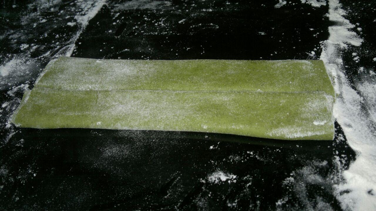 Luego, sobre una mesada enharinada, estirar 3mm de grosor con un palote y realizar cortes a los bordes, dejando la forma de un rectángulo.